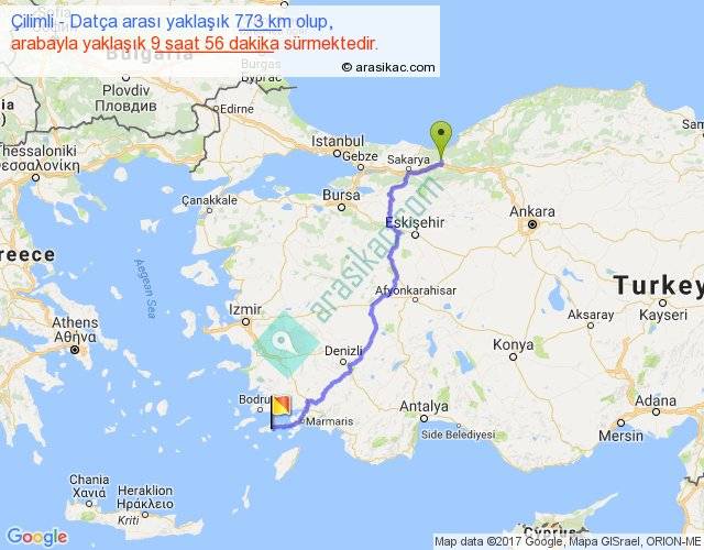Çilimli - Datça arası yaklaşık olarak 90 km/h ile yukarıda belirtilen sürede olup, iki yerin kuş uçuşu uzaklığı (mesafesi) 544'dir. Eğer belirtilen yerler arasında uçak seferi var ise bu süre uçakla 50 dakika'ya kadar düşebilir. Yolculuk otobüsle 12 saat 54 dakika sürmektedir.