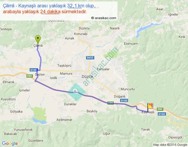 Çilimli - Kaynaşlı arası yaklaşık olarak 90 km/h ile yukarıda belirtilen sürede olup, iki yerin kuş uçuşu uzaklığı (mesafesi) 25'dir. Yolculuk otobüsle 31 dakika sürmektedir.