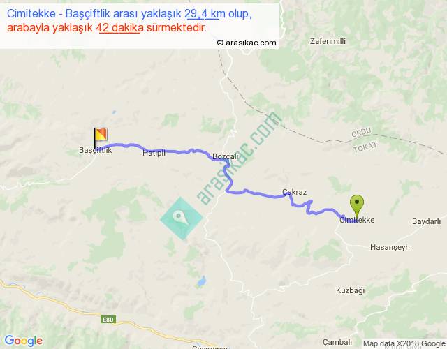 Cimitekke - Başçiftlik arası yaklaşık olarak 90 km/h ile yukarıda belirtilen sürede olup, iki yerin kuş uçuşu uzaklığı (mesafesi) 22'dir. Yolculuk otobüsle 54 dakika sürmektedir.
