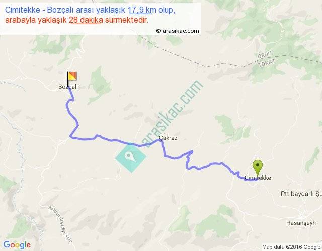 Cimitekke - Bozçalı arası yaklaşık olarak 90 km/h ile yukarıda belirtilen sürede olup, iki yerin kuş uçuşu uzaklığı (mesafesi) 12'dir. Yolculuk otobüsle 36 dakika sürmektedir.
