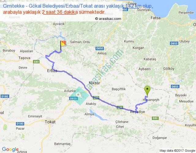 Cimitekke - Gökal Belediyesi Erbaa Tokat arası yaklaşık olarak 90 km/h ile yukarıda belirtilen sürede olup, iki yerin kuş uçuşu uzaklığı (mesafesi) 74'dir. Yolculuk otobüsle 3 saat 22 dakika sürmektedir.