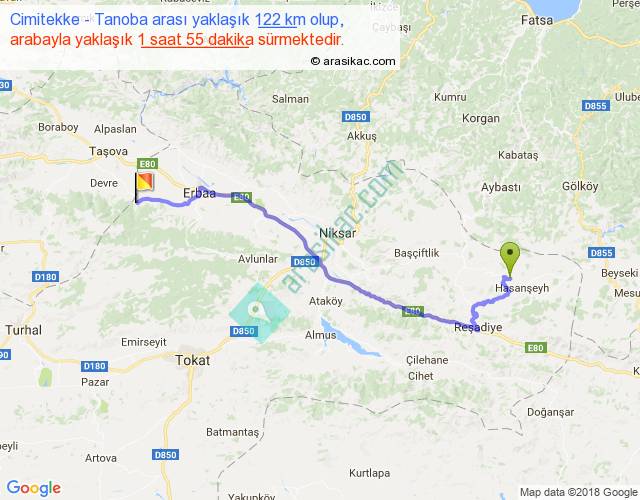 Cimitekke - Tanoba arası yaklaşık olarak 90 km/h ile yukarıda belirtilen sürede olup, iki yerin kuş uçuşu uzaklığı (mesafesi) 88'dir. Yolculuk otobüsle 2 saat 29 dakika sürmektedir.