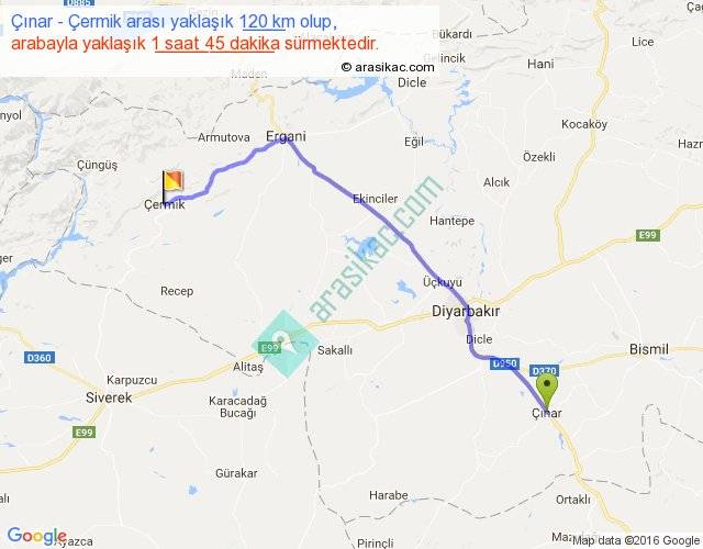 Çınar - Çermik arası yaklaşık olarak 90 km/h ile yukarıda belirtilen sürede olup, iki yerin kuş uçuşu uzaklığı (mesafesi) 95'dir. Yolculuk otobüsle 2 saat 16 dakika sürmektedir.