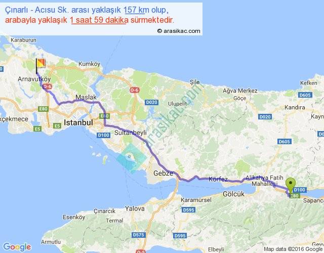 Çınarlı - Acısu Sk. arası yaklaşık olarak 90 km/h ile yukarıda belirtilen sürede olup, iki yerin kuş uçuşu uzaklığı (mesafesi) 127'dir. Yolculuk otobüsle 2 saat 34 dakika sürmektedir.