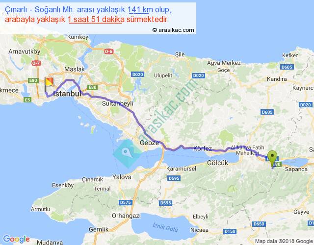 Çınarlı - Soğanlı Mh. arası yaklaşık olarak 90 km/h ile yukarıda belirtilen sürede olup, iki yerin kuş uçuşu uzaklığı (mesafesi) 112'dir. Yolculuk otobüsle 2 saat 24 dakika sürmektedir.