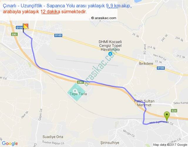 Çınarlı - Uzunçiftlik - Sapanca Yolu arası yaklaşık olarak 90 km/h ile yukarıda belirtilen sürede olup, iki yerin kuş uçuşu uzaklığı (mesafesi) 8'dir. Yolculuk otobüsle 15 dakika sürmektedir.