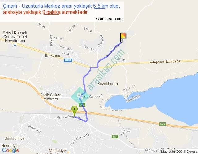 Çınarlı - Uzuntarla Merkez arası yaklaşık olarak 90 km/h ile yukarıda belirtilen sürede olup, iki yerin kuş uçuşu uzaklığı (mesafesi) 4'dir. Yolculuk otobüsle 11 dakika sürmektedir.