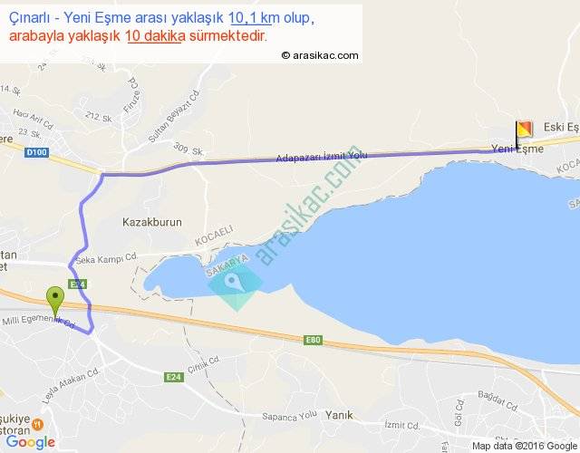 Çınarlı - Yeni Eşme arası yaklaşık olarak 90 km/h ile yukarıda belirtilen sürede olup, iki yerin kuş uçuşu uzaklığı (mesafesi) 8'dir. Yolculuk otobüsle 13 dakika sürmektedir.