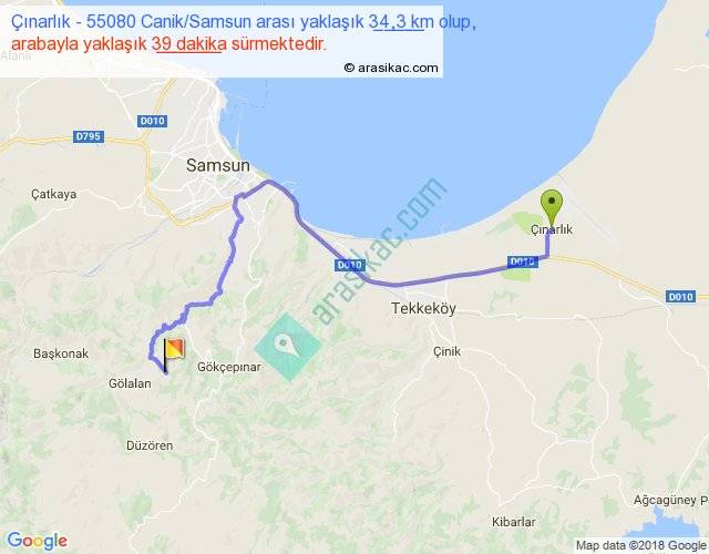 Çınarlık - 55080 Canik Samsun arası yaklaşık olarak 90 km/h ile yukarıda belirtilen sürede olup, iki yerin kuş uçuşu uzaklığı (mesafesi) 21'dir. Yolculuk otobüsle 50 dakika sürmektedir.