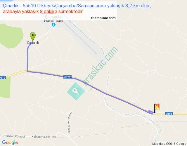 Çınarlık - 55510 Dikbıyık Çarşamba Samsun arası yaklaşık olarak 90 km/h ile yukarıda belirtilen sürede olup, iki yerin kuş uçuşu uzaklığı (mesafesi) 7'dir. Yolculuk otobüsle 11 dakika sürmektedir.