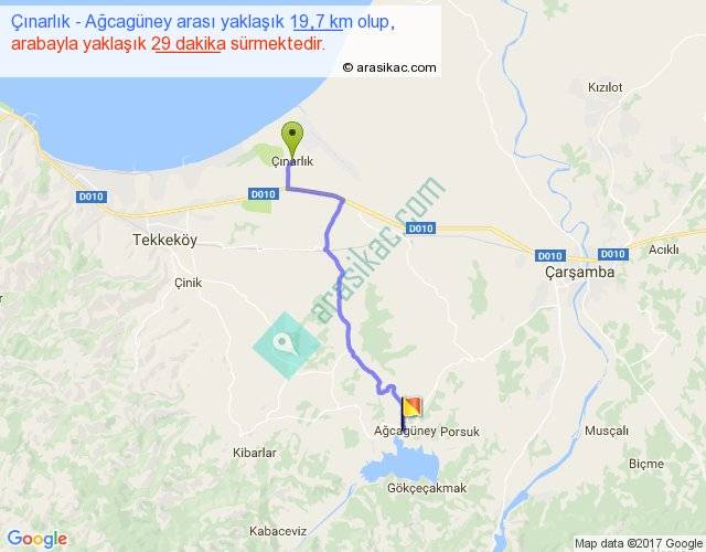Çınarlık - Ağcagüney arası yaklaşık olarak 90 km/h ile yukarıda belirtilen sürede olup, iki yerin kuş uçuşu uzaklığı (mesafesi) 15'dir. Yolculuk otobüsle 37 dakika sürmektedir.