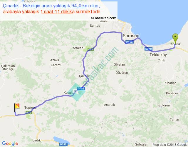 Çınarlık - Bekdiğin arası yaklaşık olarak 90 km/h ile yukarıda belirtilen sürede olup, iki yerin kuş uçuşu uzaklığı (mesafesi) 68'dir. Yolculuk otobüsle 1 saat 32 dakika sürmektedir.