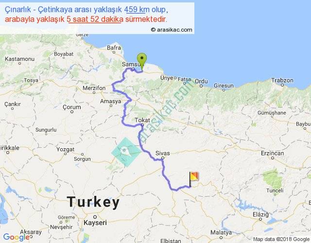Çınarlık - Çetinkaya arası yaklaşık olarak 90 km/h ile yukarıda belirtilen sürede olup, iki yerin kuş uçuşu uzaklığı (mesafesi) 239'dir. Yolculuk otobüsle 7 saat 37 dakika sürmektedir.