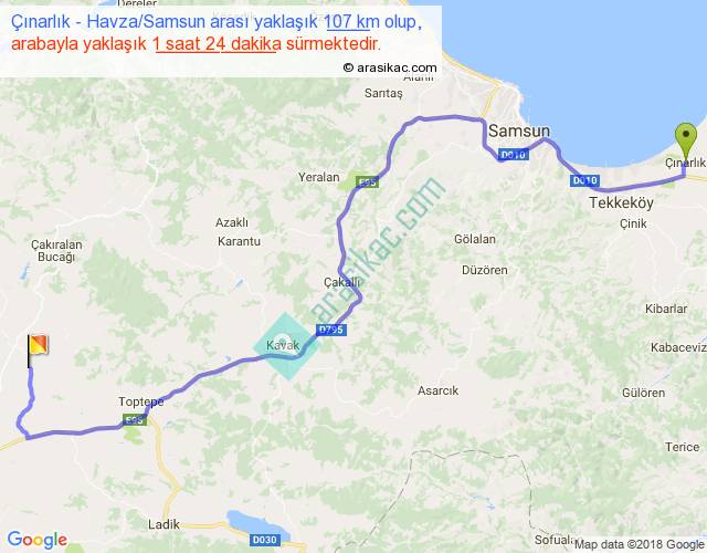 Çınarlık - Havza Samsun arası yaklaşık olarak 90 km/h ile yukarıda belirtilen sürede olup, iki yerin kuş uçuşu uzaklığı (mesafesi) 71'dir. Yolculuk otobüsle 1 saat 49 dakika sürmektedir.