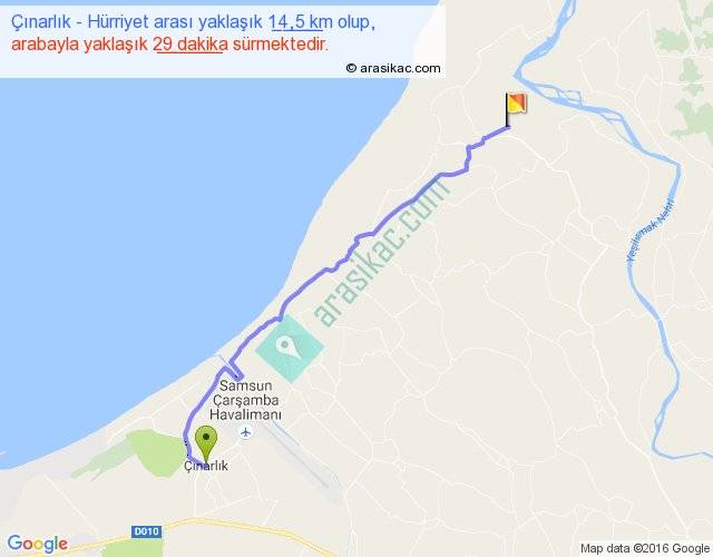 Çınarlık - Hürriyet arası yaklaşık olarak 90 km/h ile yukarıda belirtilen sürede olup, iki yerin kuş uçuşu uzaklığı (mesafesi) 12'dir. Yolculuk otobüsle 37 dakika sürmektedir.