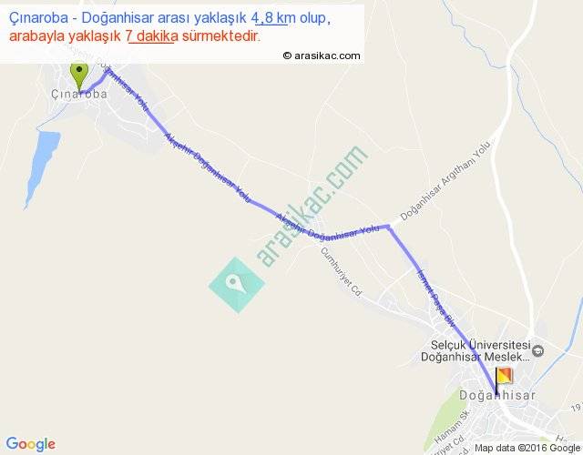 Çınaroba - Doğanhisar arası yaklaşık olarak 90 km/h ile yukarıda belirtilen sürede olup, iki yerin kuş uçuşu uzaklığı (mesafesi) 4'dir. Yolculuk otobüsle 9 dakika sürmektedir.