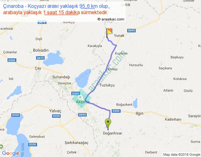 Çınaroba - Koçyazı arası yaklaşık olarak 90 km/h ile yukarıda belirtilen sürede olup, iki yerin kuş uçuşu uzaklığı (mesafesi) 70'dir. Yolculuk otobüsle 1 saat 37 dakika sürmektedir.