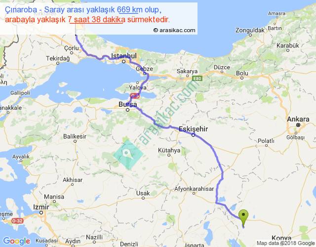 Çınaroba - Saray arası yaklaşık olarak 90 km/h ile yukarıda belirtilen sürede olup, iki yerin kuş uçuşu uzaklığı (mesafesi) 480'dir. Eğer belirtilen yerler arasında uçak seferi var ise bu süre uçakla 44 dakika'ya kadar düşebilir. Yolculuk otobüsle 9 saat 55 dakika sürmektedir.