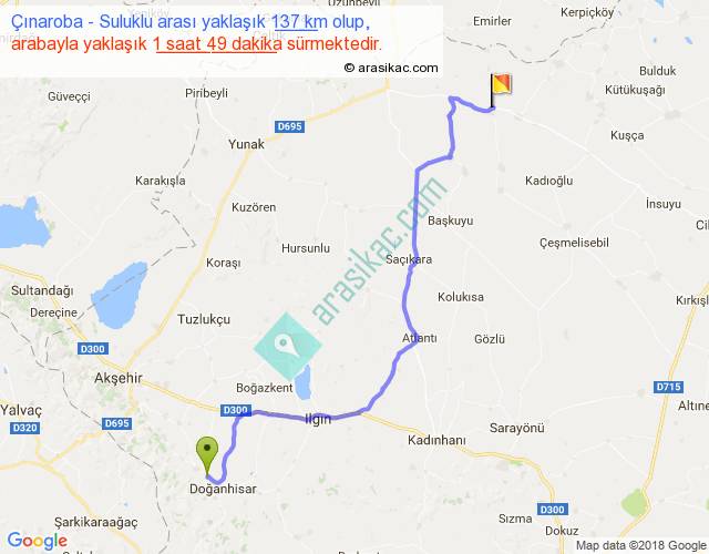 Çınaroba - Suluklu arası yaklaşık olarak 90 km/h ile yukarıda belirtilen sürede olup, iki yerin kuş uçuşu uzaklığı (mesafesi) 100'dir. Yolculuk otobüsle 2 saat 21 dakika sürmektedir.