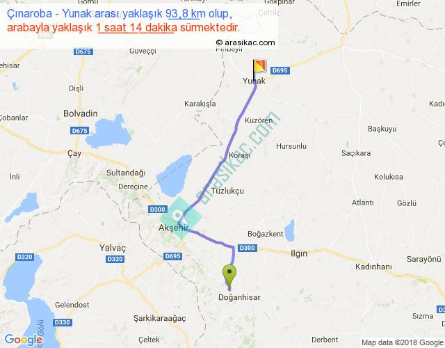 Çınaroba - Yunak arası yaklaşık olarak 90 km/h ile yukarıda belirtilen sürede olup, iki yerin kuş uçuşu uzaklığı (mesafesi) 72'dir. Yolculuk otobüsle 1 saat 36 dakika sürmektedir.