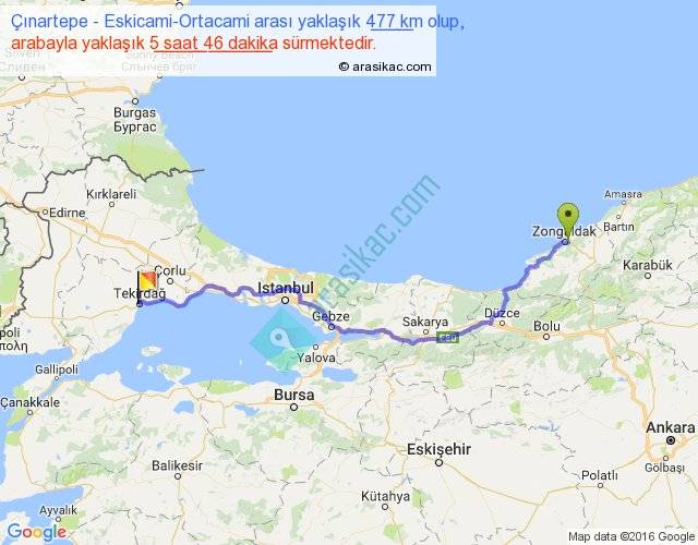 Çınartepe - Eskicami-Ortacami arası yaklaşık olarak 90 km/h ile yukarıda belirtilen sürede olup, iki yerin kuş uçuşu uzaklığı (mesafesi) 362'dir. Eğer belirtilen yerler arasında uçak seferi var ise bu süre uçakla 33 dakika'ya kadar düşebilir. Yolculuk otobüsle 7 saat 29 dakika sürmektedir.