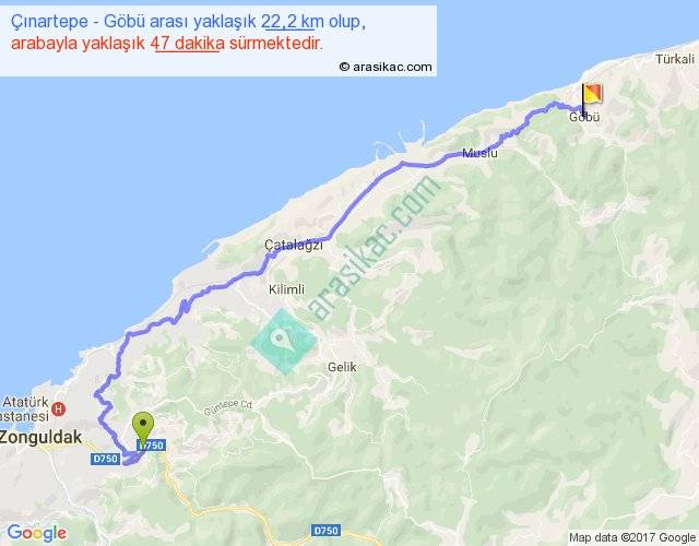 Çınartepe - Göbü arası yaklaşık olarak 90 km/h ile yukarıda belirtilen sürede olup, iki yerin kuş uçuşu uzaklığı (mesafesi) 14'dir. Yolculuk otobüsle 1 saat 1 dakika sürmektedir.