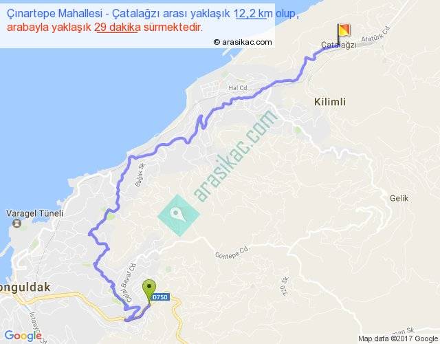 Çınartepe Mahallesi - Çatalağzı arası yaklaşık olarak 90 km/h ile yukarıda belirtilen sürede olup, iki yerin kuş uçuşu uzaklığı (mesafesi) 7'dir. Yolculuk otobüsle 37 dakika sürmektedir.