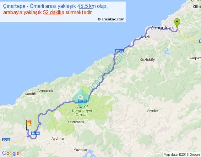Çınartepe - Ömerli arası yaklaşık olarak 90 km/h ile yukarıda belirtilen sürede olup, iki yerin kuş uçuşu uzaklığı (mesafesi) 33'dir. Yolculuk otobüsle 1 saat 7 dakika sürmektedir.