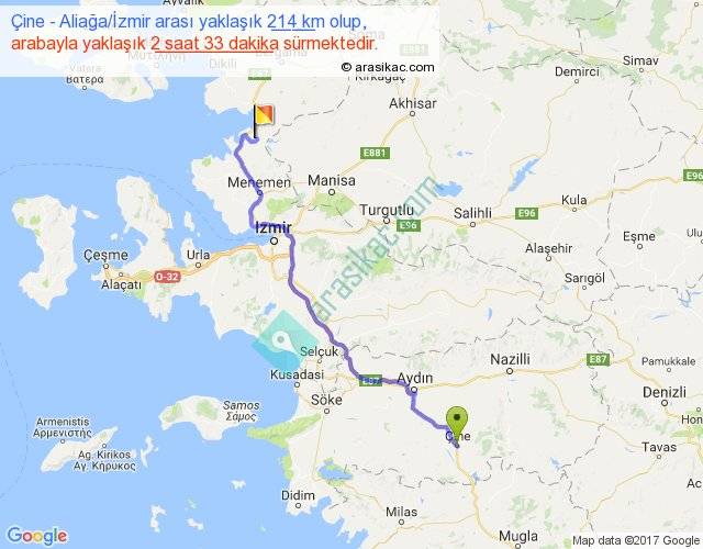 Çine - Aliağa İzmir arası yaklaşık olarak 90 km/h ile yukarıda belirtilen sürede olup, iki yerin kuş uçuşu uzaklığı (mesafesi) 160'dir. Yolculuk otobüsle 3 saat 18 dakika sürmektedir.