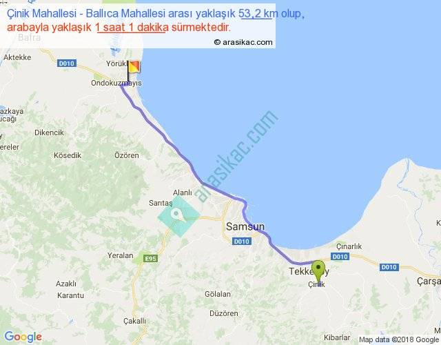Çinik Mahallesi - Ballıca Mahallesi arası yaklaşık olarak 90 km/h ile yukarıda belirtilen sürede olup, iki yerin kuş uçuşu uzaklığı (mesafesi) 46'dir. Yolculuk otobüsle 1 saat 19 dakika sürmektedir.