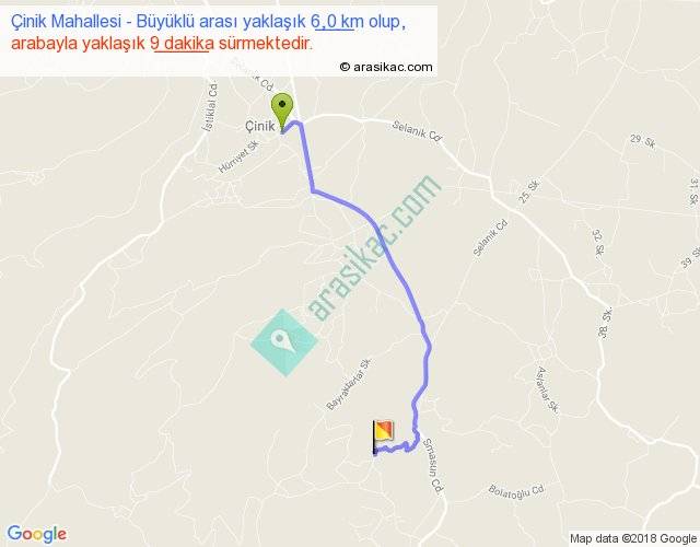 Çinik Mahallesi - Büyüklü arası yaklaşık olarak 90 km/h ile yukarıda belirtilen sürede olup, iki yerin kuş uçuşu uzaklığı (mesafesi) 4'dir. Yolculuk otobüsle 11 dakika sürmektedir.
