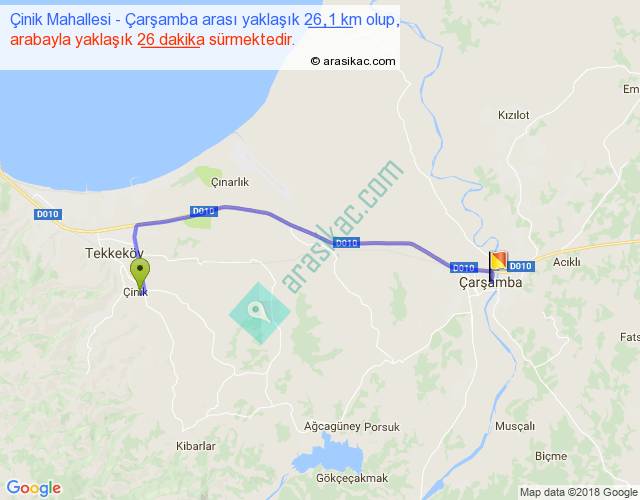 Çinik Mahallesi - Çarşamba arası yaklaşık olarak 90 km/h ile yukarıda belirtilen sürede olup, iki yerin kuş uçuşu uzaklığı (mesafesi) 20'dir. Yolculuk otobüsle 33 dakika sürmektedir.