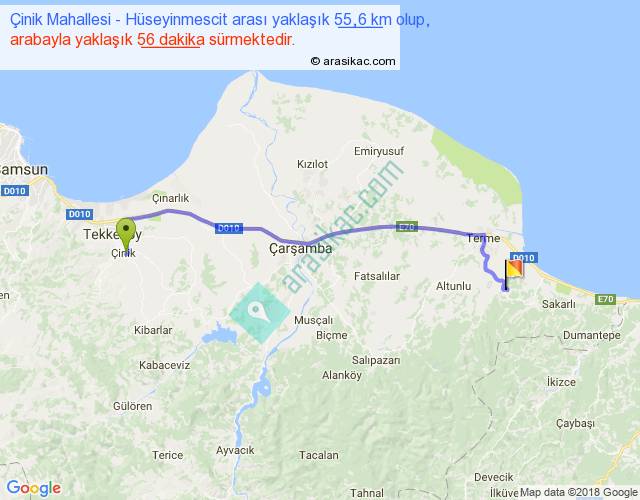 Çinik Mahallesi - Hüseyinmescit arası yaklaşık olarak 90 km/h ile yukarıda belirtilen sürede olup, iki yerin kuş uçuşu uzaklığı (mesafesi) 44'dir. Yolculuk otobüsle 1 saat 12 dakika sürmektedir.
