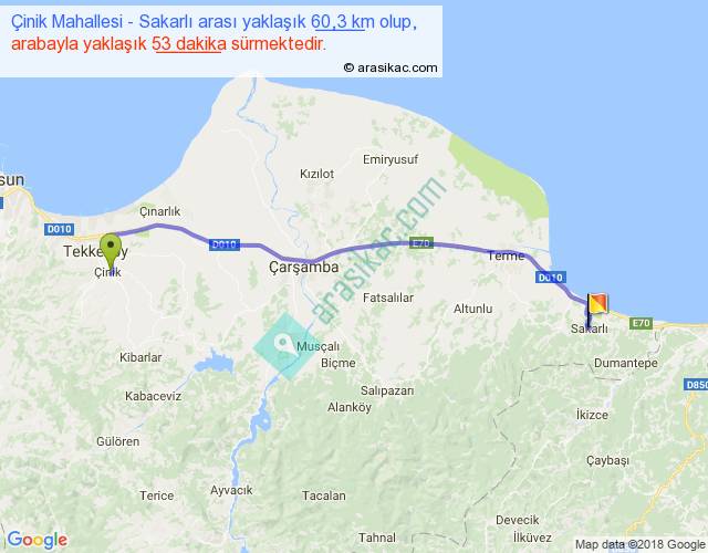 Çinik Mahallesi - Sakarlı arası yaklaşık olarak 90 km/h ile yukarıda belirtilen sürede olup, iki yerin kuş uçuşu uzaklığı (mesafesi) 50'dir. Yolculuk otobüsle 1 saat 8 dakika sürmektedir.