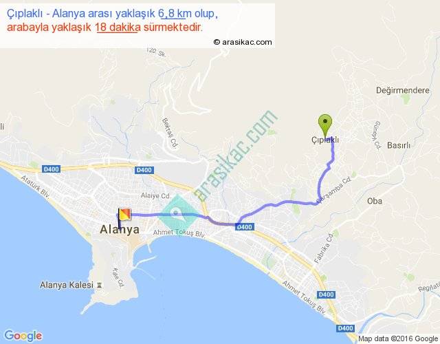 Çıplaklı - Alanya arası yaklaşık olarak 90 km/h ile yukarıda belirtilen sürede olup, iki yerin kuş uçuşu uzaklığı (mesafesi) 5'dir. Yolculuk otobüsle 23 dakika sürmektedir.
