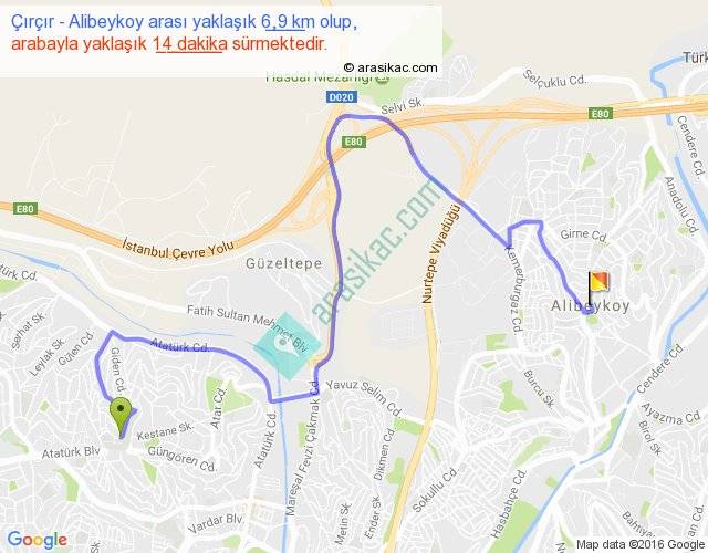 Çırçır - Alibeykoy arası yaklaşık olarak 90 km/h ile yukarıda belirtilen sürede olup, iki yerin kuş uçuşu uzaklığı (mesafesi) 3'dir. Yolculuk otobüsle 18 dakika sürmektedir.