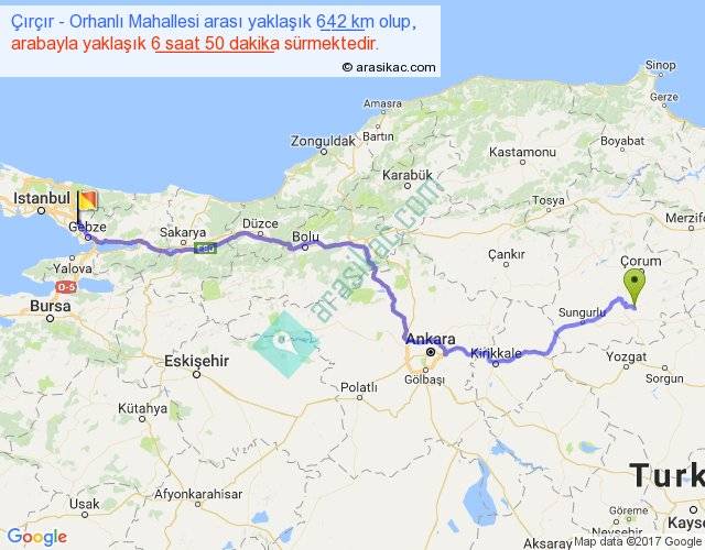 Çırçır - Orhanlı Mahallesi arası yaklaşık olarak 90 km/h ile yukarıda belirtilen sürede olup, iki yerin kuş uçuşu uzaklığı (mesafesi) 470'dir. Eğer belirtilen yerler arasında uçak seferi var ise bu süre uçakla 43 dakika'ya kadar düşebilir. Yolculuk otobüsle 8 saat 53 dakika sürmektedir.
