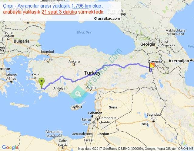 Çırpı - Ayrancılar arası yaklaşık olarak 90 km/h ile yukarıda belirtilen sürede olup, iki yerin kuş uçuşu uzaklığı (mesafesi) 1381'dir. Eğer belirtilen yerler arasında uçak seferi var ise bu süre uçakla 2 saat 07 dakika'ya kadar düşebilir. Yolculuk otobüsle 1 gün 3 saat sürmektedir.