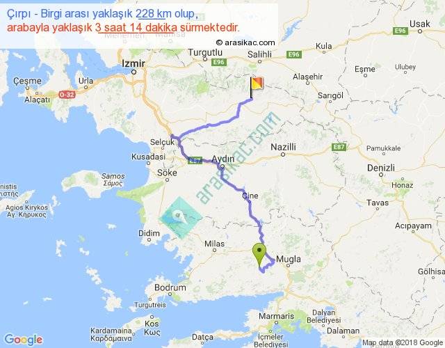Çırpı - Birgi arası yaklaşık olarak 90 km/h ile yukarıda belirtilen sürede olup, iki yerin kuş uçuşu uzaklığı (mesafesi) 117'dir. Yolculuk otobüsle 4 saat 12 dakika sürmektedir.