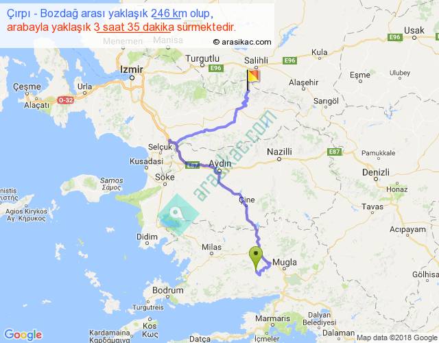 Çırpı - Bozdağ arası yaklaşık olarak 90 km/h ile yukarıda belirtilen sürede olup, iki yerin kuş uçuşu uzaklığı (mesafesi) 126'dir. Yolculuk otobüsle 4 saat 39 dakika sürmektedir.