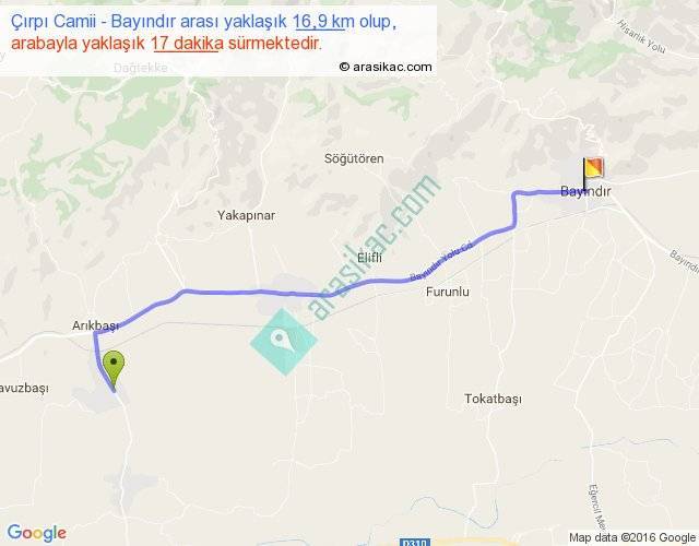 Çırpı Camii - Bayındır arası yaklaşık olarak 90 km/h ile yukarıda belirtilen sürede olup, iki yerin kuş uçuşu uzaklığı (mesafesi) 14'dir. Yolculuk otobüsle 22 dakika sürmektedir.