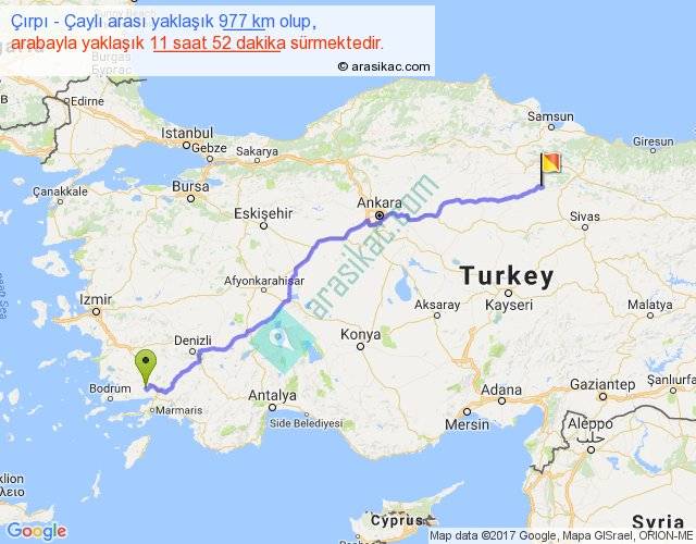 Çırpı - Çaylı arası yaklaşık olarak 90 km/h ile yukarıda belirtilen sürede olup, iki yerin kuş uçuşu uzaklığı (mesafesi) 775'dir. Eğer belirtilen yerler arasında uçak seferi var ise bu süre uçakla 1 saat 11 dakika'ya kadar düşebilir. Yolculuk otobüsle 15 saat 25 dakika sürmektedir.