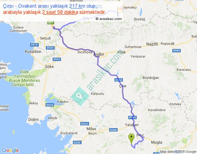 Çırpı - Ovakent arası yaklaşık olarak 90 km/h ile yukarıda belirtilen sürede olup, iki yerin kuş uçuşu uzaklığı (mesafesi) 100'dir. Yolculuk otobüsle 3 saat 51 dakika sürmektedir.