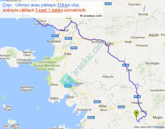 Çırpı - Ürkmez arası yaklaşık olarak 90 km/h ile yukarıda belirtilen sürede olup, iki yerin kuş uçuşu uzaklığı (mesafesi) 143'dir. Yolculuk otobüsle 3 saat 55 dakika sürmektedir.