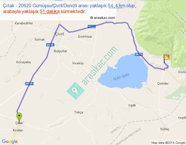 Çıtak - 20620 Gümüşsu Çivril Denizli arası yaklaşık olarak 90 km/h ile yukarıda belirtilen sürede olup, iki yerin kuş uçuşu uzaklığı (mesafesi) 32'dir. Yolculuk otobüsle 1 saat 6 dakika sürmektedir.