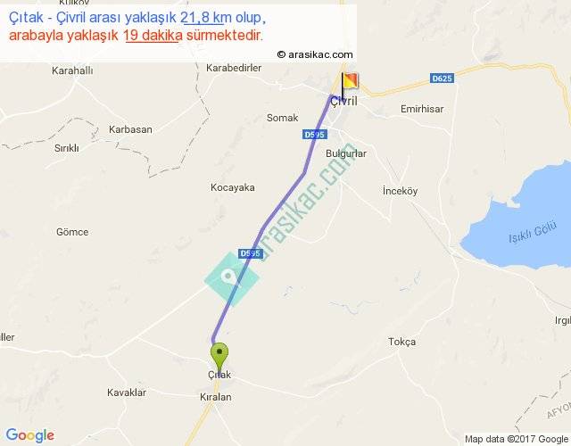 Çıtak - Çivril arası yaklaşık olarak 90 km/h ile yukarıda belirtilen sürede olup, iki yerin kuş uçuşu uzaklığı (mesafesi) 20'dir. Yolculuk otobüsle 24 dakika sürmektedir.