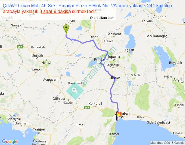 Çıtak - Liman Mah.46 Sok. Pınarlar Plaza F Blok No:7 A arası yaklaşık olarak 90 km/h ile yukarıda belirtilen sürede olup, iki yerin kuş uçuşu uzaklığı (mesafesi) 166'dir. Yolculuk otobüsle 4 saat 5 dakika sürmektedir.