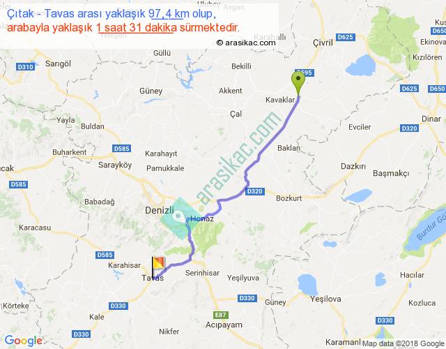 Çıtak - Tavas arası yaklaşık olarak 90 km/h ile yukarıda belirtilen sürede olup, iki yerin kuş uçuşu uzaklığı (mesafesi) 80'dir. Yolculuk otobüsle 1 saat 58 dakika sürmektedir.