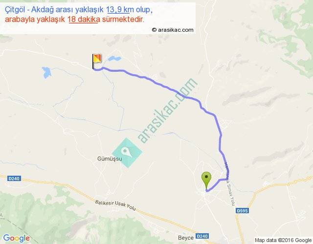 Çitgöl - Akdağ arası yaklaşık olarak 90 km/h ile yukarıda belirtilen sürede olup, iki yerin kuş uçuşu uzaklığı (mesafesi) 10'dir. Yolculuk otobüsle 23 dakika sürmektedir.