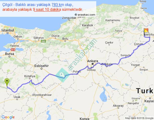 Çitgöl - Balıklı arası yaklaşık olarak 90 km/h ile yukarıda belirtilen sürede olup, iki yerin kuş uçuşu uzaklığı (mesafesi) 567'dir. Eğer belirtilen yerler arasında uçak seferi var ise bu süre uçakla 52 dakika'ya kadar düşebilir. Yolculuk otobüsle 11 saat 55 dakika sürmektedir.